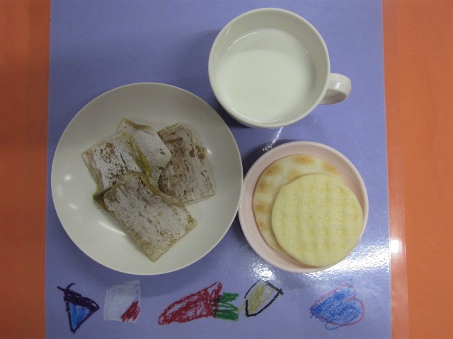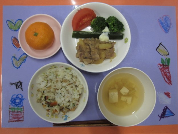 ホームきょうの給食 1/ 12 今日の給食 2023年1月12日 子どもたちが大好きな給食やおやつを毎日紹介しています! 【幼児食・乳児食】 昼食 五目ごはん すまし汁 ポテトと豚肉のごまみそ煮 ボイル野菜マヨドレ添え トマト はっさく 本日のマットはまつ組さん♪ 残食なし(^▽^)/ はっさくは酸味もあるけれど 甘みもあるね~♪ 3時のおやつ 牛乳 干し芋 せんべい 10時おやつ(乳児) ・ジョア