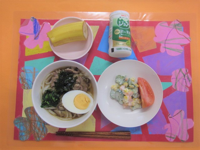 ホームきょうの給食 7/ 8 今日の給食 2023年7月8日2023年7月10日 子どもたちが大好きな給食やおやつを毎日紹介しています! 【幼児食・乳児食】 昼食 ・五目うどん ・マヨドレ和え ・トマト ・ジョア ・バナナ 本日のランチョンマットは・・・ 【どんぐり組】さん作です★ 【くるみ組】さんでは ”たくさん食べて怪獣をやっつけよう ビーム作戦”☆★☆彡 を、絶賛実行中です! 3時のおやつ 牛乳 わかめおにぎり ぬか漬け 10時おやつ(乳児) ・牛乳