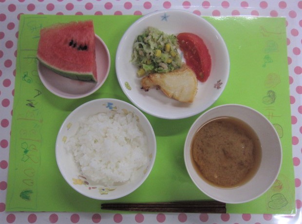 ホームきょうの給食 8/ 15 今日の給食 2023年8月15日 子どもたちが大好きな給食やおやつを毎日紹介しています! 【幼児食・乳児食】 昼食 ・ごはん ・みそ汁 ・魚のガーリック焼き ・ブロッコリーサラダ ・トマト ・すいか 本日のランチョンマットは・・・ 【くるみ組】さん作です★ 【くるみ組】さんでは ”たくさん食べて怪獣をやっつけよう ビーム作戦”☆★☆彡 を、絶賛実行中です。 第一章のゴールが 見えてきたかも…‼ 🥰本日も良く食べてくれました(^▽^)/ 3時のおやつ 牛乳 ジャムサンド 10時おやつ(乳児) ・ジョアに変更しました。