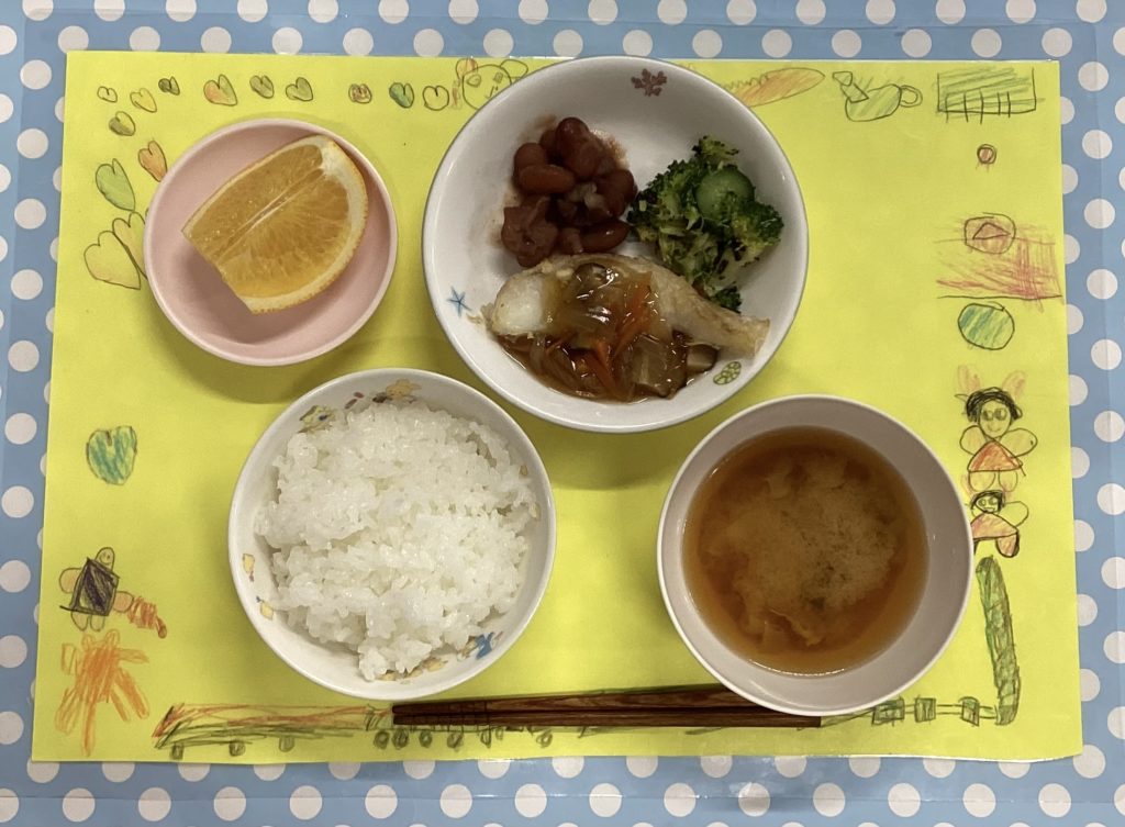 ホームきょうの給食 2/ 1今日の給食 2024年2月1日 子どもたちが大好きな給食やおやつを毎日紹介しています! 【幼児食・乳児食】 昼食 ・ごはん ・みそ汁 ・魚のあんかけ ・昆布和え ・煮豆 ・はっさく 本日のランチョンマットは・・ 【まつ組】さん作です★ 🥰純和食は人気あるんです! 3時のおやつ ジョア ポトフ 10時おやつ(乳児) ・牛乳