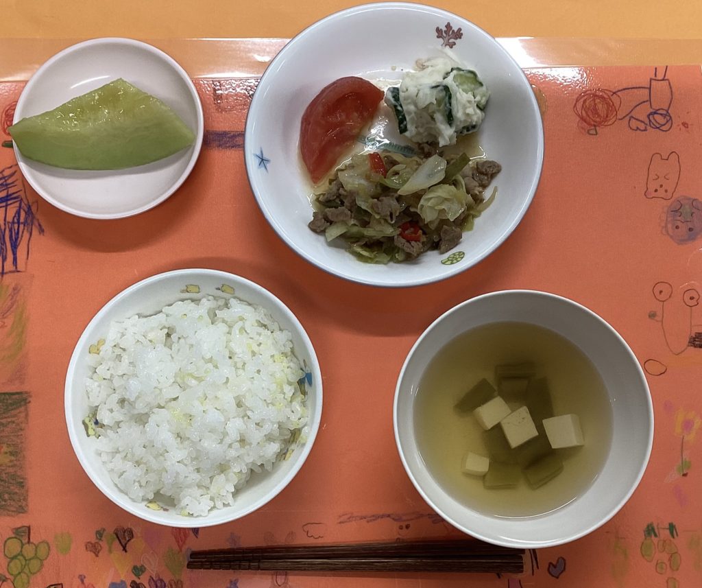 ホームきょうの給食 6 / 5 今日の給食 2024年6月6日 子どもたちが大好きな給食やおやつを毎日紹介しています! 【幼児食・乳児食】 昼食 ・きびごはん ・すまし汁 ・豚肉のみそ炒め ・ポテトサラダ ・トマト ・メロン 本日のランチョンマットは まつ組さん作です😘 😍お肉大人気でした❤️ 3時のおやつ ジョア バナナきな粉サンド 10時おやつ(乳児) ・牛乳