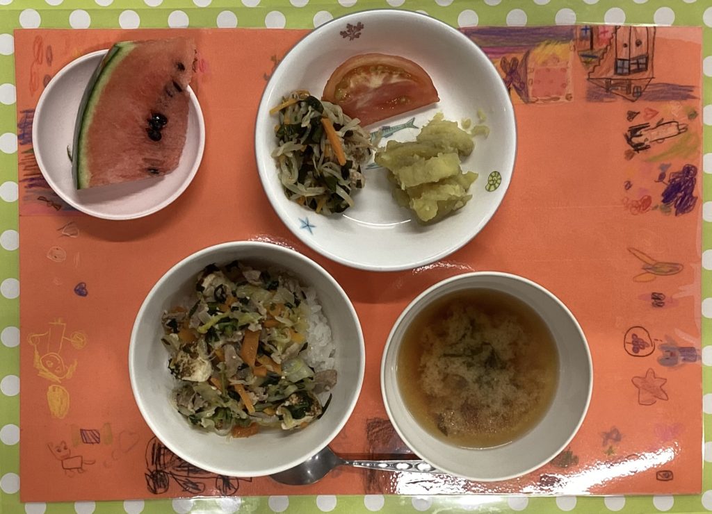 ホームきょうの給食 7/ 8 今日の給食 2024年7月8日 子どもたちが大好きな給食やおやつを毎日紹介しています! 【幼児食・乳児食】 昼食 ・すき焼き丼 ・みそ汁 ・ワカメのナムル風 ・さつま芋の甘煮 ・トマト ・すいか 🥰すいか、あま〜い🩷 3時のおやつ • 牛乳 • ガーリックチャーハン • ぬか漬け 10時おやつ(乳児) ・牛乳