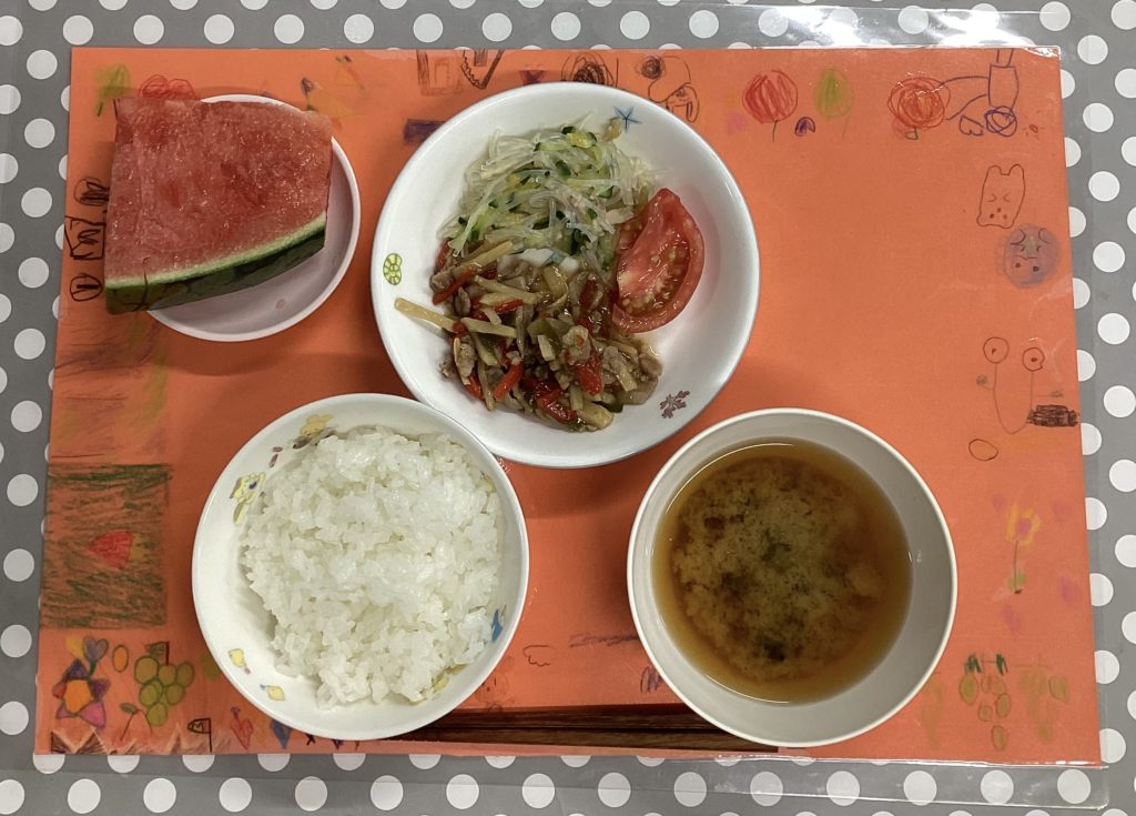 ホームきょうの給食 7/ 18 今日の給食 2024年7月18日 子どもたちが大好きな給食やおやつを毎日紹介しています! 【幼児食・乳児食】 昼食 ・ごはん ・みそ汁 ・チンジャオロースー ・バンサンスー ・トマト ・すいか 😋中華なメニュー🩷 本日も良く食べてありました。 3時のおやつ • 牛乳 • 水ようかん 10時おやつ(乳児) ・牛乳