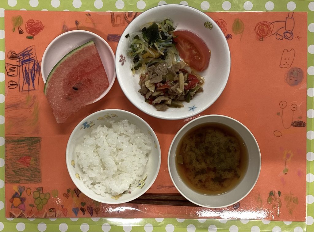 ホームきょうの給食 8/ 1 今日の給食 2024年8月1日 子どもたちが大好きな給食やおやつを毎日紹介しています! 【幼児食・乳児食】 昼食 ・ごはん ・みそ汁 ・チンジャオロースー ・バンサンスー ・トマト ・すいか 🥰チンジャオロースーよく食べてくれました。 3時のおやつ • 牛乳 •リンゴゼリー •せんべい 10時おやつ(乳児) ・牛乳