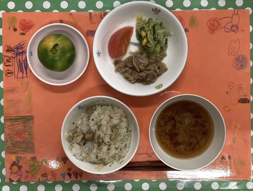 ホームきょうの給食 9/26 今日の給食 2024年9月26日 子どもたちが大好きな給食やおやつを毎日紹介しています! 【幼児食・乳児食】 昼食 • 五目ごはん • みそ汁 • 豚肉のおろし煮 • ミックスサラダ • トマト • みかん ☺️年中組さん! よく食べたくれたね〜 3時のおやつ • 牛乳 • 焼き芋 10時おやつ(乳児) ・牛乳