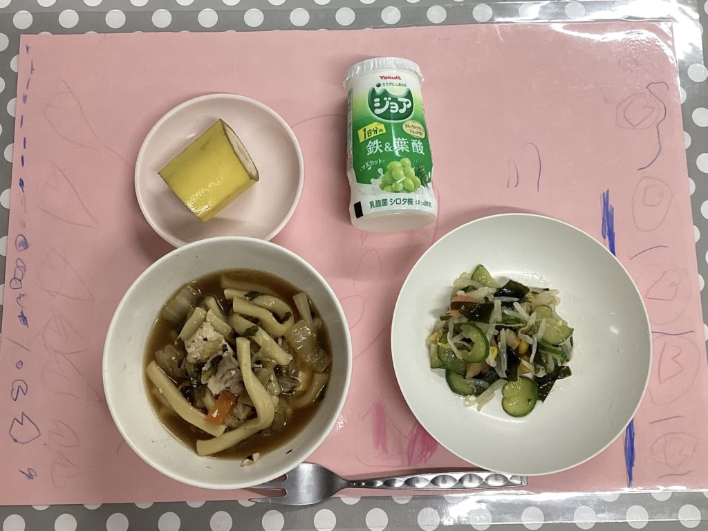 ホームきょうの給食 11/2 今日の給食 2024年11月2日 子どもたちが大好きな給食やおやつを毎日紹介しています! 【幼児食・乳児食】 昼食 • すき焼き風うどん • 和風サラダ • ジョア • バナナ 🥰今週もたくさん食べて くれてありがとう〜😘 3時のおやつ • 牛乳 • わかめおにぎり • ボイル人参 10時おやつ(乳児) ・牛乳