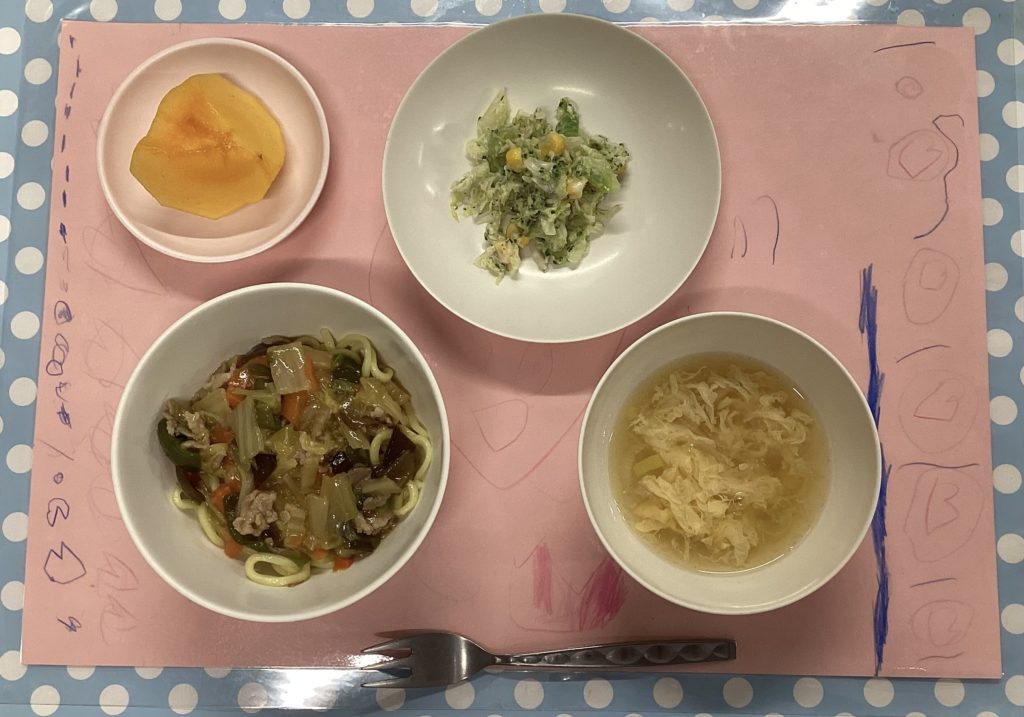 ホームきょうの給食 11/9 今日の給食 2024年11月9日 子どもたちが大好きな給食やおやつを毎日紹介しています! 【幼児食・乳児食】 昼食 • あんかけ焼きそば (乳児 あんかけうどん) • かき玉汁 • ガーリック風サラダ • 柿 🥰今週もお疲れ様☆ 3時のおやつ • 牛乳 • おかかおにぎり • 食べる小魚 10時おやつ(乳児) ・牛乳