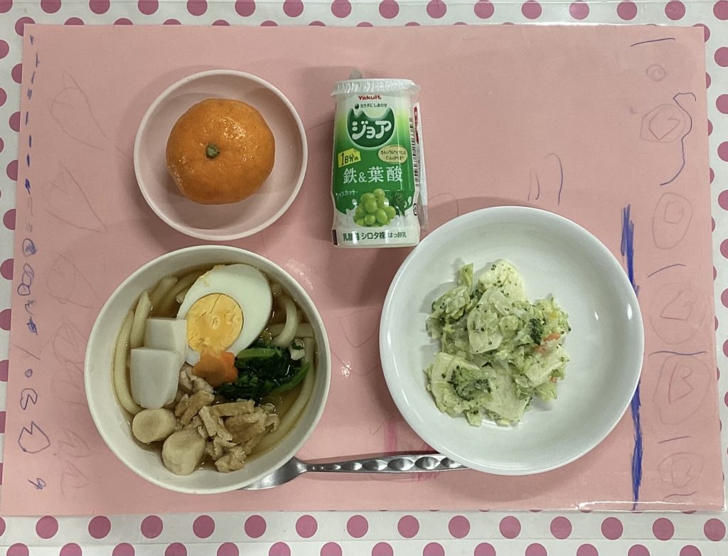ホームきょうの給食 12/28 今日の給食 2024年12月28日 子どもたちが大好きな給食やおやつを毎日紹介しています! 【幼児食・乳児食】 昼食 • 年越しうどん • キャベツとりんごのサラダ • ジョア • みかん 🥰今年の食べ納めです💕 3時のおやつ • 牛乳 • ゆかりおにぎり • ボイル人参 10時おやつ(乳児) ・牛乳