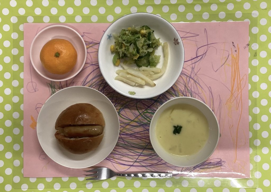 ホームきょうの給食 1/15 今日の給食 2025年1月15日 子どもたちが大好きな給食やおやつを毎日紹介しています! 【幼児食・乳児食】 昼食 • ホットドッグ • コーンスープ • ブロッコリーサラダ • フライドポテト • みかん 🥰本日も…完食です☆ 3時のおやつ • ジョア • みそおじや • ボイル人参 10時おやつ(乳児) ・牛乳