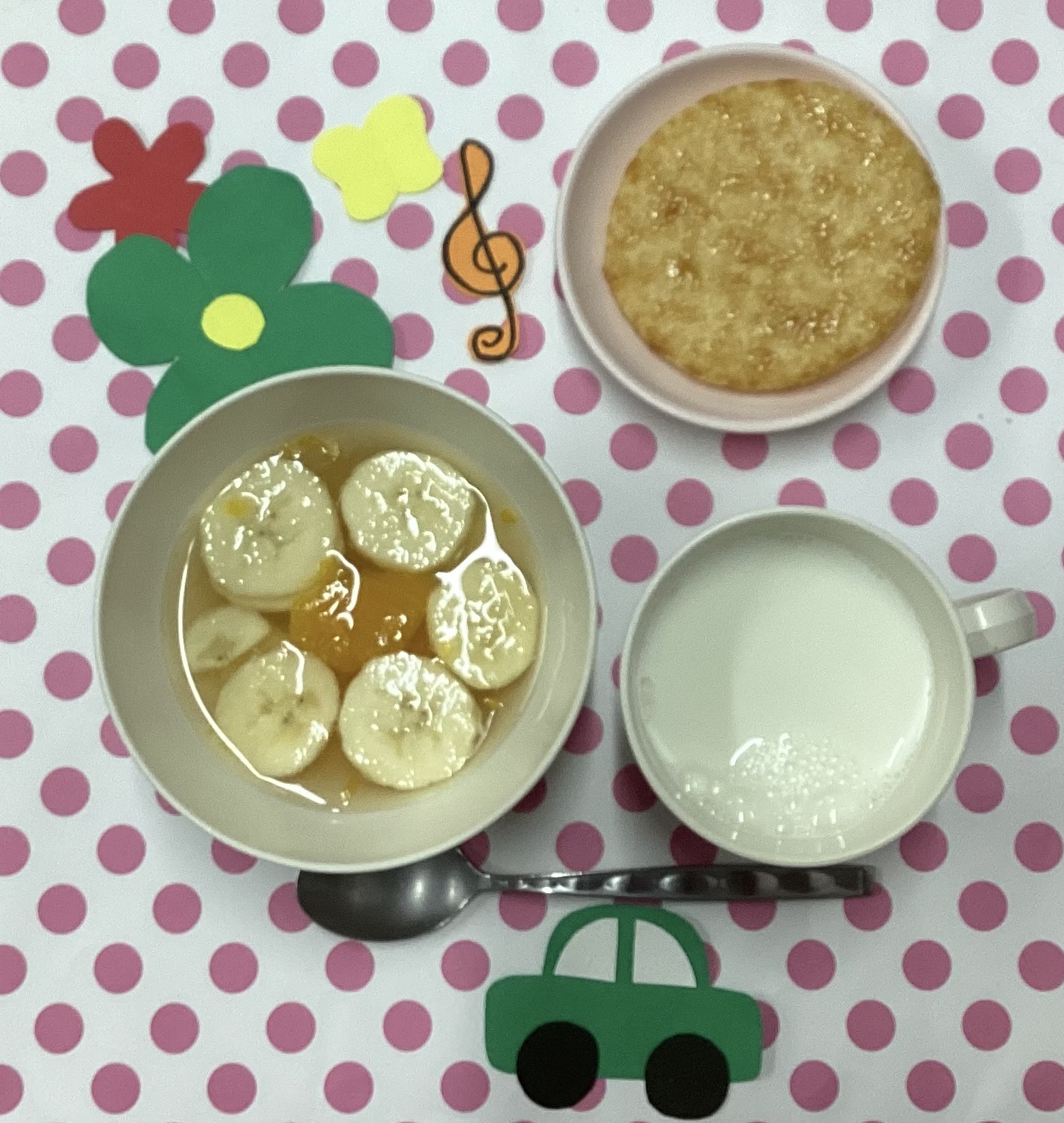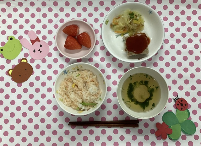 ホームきょうの給食 4/1 今日の給食 2026年4月1日2026年4月3日 子どもたちが大好きな給食やおやつを毎日紹介しています! 【幼児食・乳児食】 昼食 • お花畑ごはん • すまし汁 • みんなのミートローフ • キャベツサラダ • いちご 今日もよく食べてありました😋 3時のおやつ • 牛乳 • フルーツポンチ •おせんべい 10時のおやつ(乳児のみ) 野菜ジュース