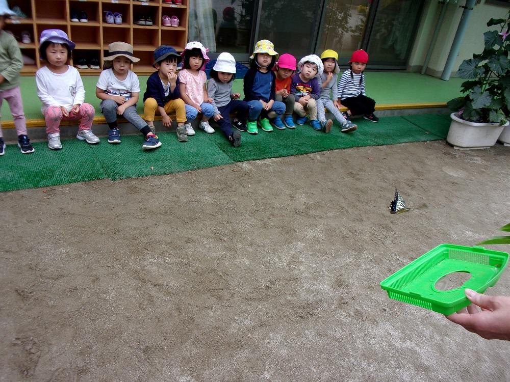 ホーム アゲハの旅立ち 2022年6月10日2023年3月1日 昨日、3歳児どんぐり組で育てていたアゲハが羽化しました。登園して1匹、午睡中に2匹…。子どもたちに見送られて元気に羽ばたいていきました。これで全クラスのアゲハが羽化しました。来年も待ってるよぉ~!そして0歳児つぼみ組さんは近所をワゴン車に乗って散策…。短い時間でしたが良い気分転換になったようです。 0歳児お散歩① 0歳児お散歩② 0歳児「ただいま」 3歳児「あれあれ…とばないねぇ~」 「あっ!とんだよぉ」 「ばいば~い!げんきでねぇ~」