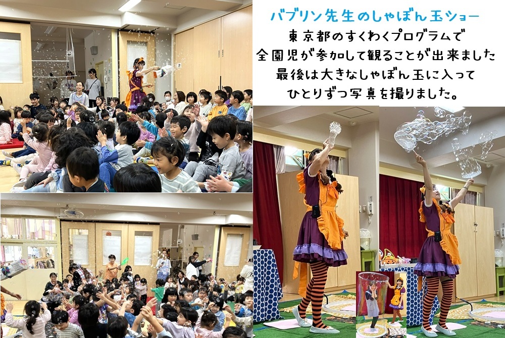 今日は東京都のすくわくプログラムで、バブリン先生をお呼びして「しゃぼん玉ショー」を全園児で観ました。家庭にある物(ハサミ・牛乳パック・ペットボトル・ハンガー)でシャボン玉が出来ると「わぁ~」と歓声が…。煙を入れたものや、大きなものまで観た後は、100万個のシャボン玉が子どもたちの頭上に!大興奮で触ったり、眺めたりしていました。子どもたちも先生たちも楽しめたひと時でした。