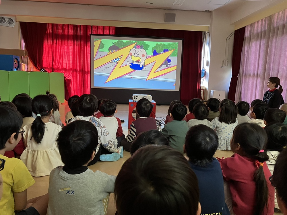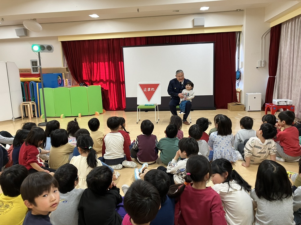 ホーム 交通安全教室🚓 2026年3月5日 2月10日に幼児クラスを対象に交通安全教室を行いました。お巡りさんに来ていただき、交通ルールのDVDを鑑賞後、4・5歳児が信号機・横断歩道の模型を使って歩行の体験をしました。横断歩道ではしっかりと手を上げて(手を上げることでドライバーから見えやすいようにします)右→左→もう一度右を見て確認してから渡ります。ご家庭でも交通ルールをしっかり守りましょう! DVD鑑賞 お友達のしんちゃん登場 実際に横断歩道を渡りました