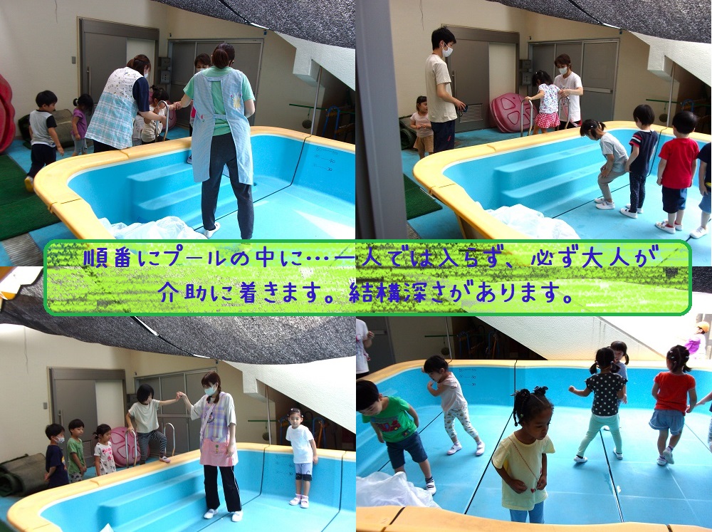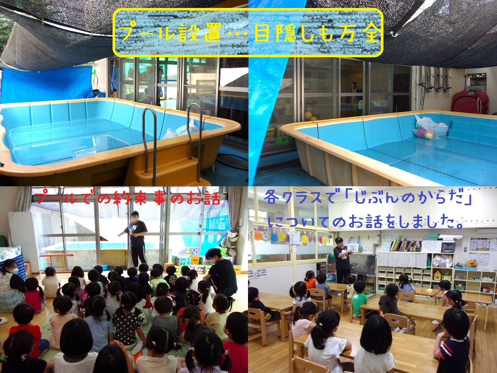 ホーム 水遊び始め🩲🩱 2023年6月26日 今日は「水遊び始め」…ということで、幼児クラスの子どもたちに、プールに入る時のお約束事をお話ししました。①水着に着替えたら準備体操②プールに入る前にシャワー③プールに出入りするときは先生が介助④プールの中は走らない⑤嫌がるお友達に水をかけない…等お話しました。その後順番にプールの中に入ってみました。そして各クラス毎、「じぶんのからだ」についての大事なお話をしました。今日はお話だけでしたが、明日からはたくさん遊べると良いですね。準備・プールカードの記入を忘れずにお願いします。