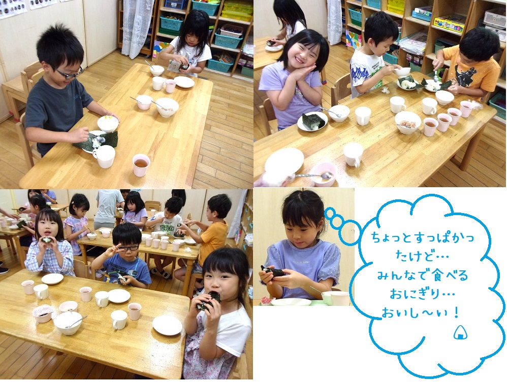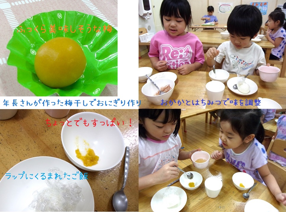 1か月ほど前に漬けた梅の実が食べごろになり、本日みんなでおやつに食べました。年長クラスは自分たちで味を調整して、「おにぎり」にして食べました。そのままの梅をまず一口…あまりの酸っぱさにみんな震えていました。はちみつや鰹節を足してみると酸っぱさがなくなり、おにぎりにすると更においしさ倍増!「おいし~い」の顔が可愛かったです。