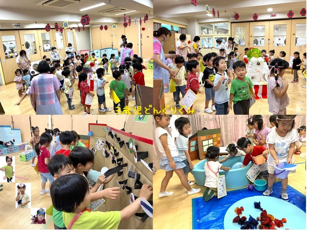ホーム 夏まつり~幼児編~ 2023年8月25日 今日は幼児クラスが夏まつりを楽しみました。近くの保育園ドリームキッズのお友達5名も遊びに来てくれました。今日の日を楽しみにしていた子どもたち…盆踊りの後にゲーム等を始めたのですが、まず向かった先は「お面コーナー」。何を選ぶのか決めてきている子は、我先にとお目当てのお面を取っていました。「どれにしようかなぁ~」と迷っている子もいましたが、嬉しそうにつけてくれていました。ゲームコーナーも子どもたちだけで回って遊べていました。くるみさんみんな頑張っていました。