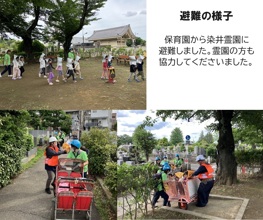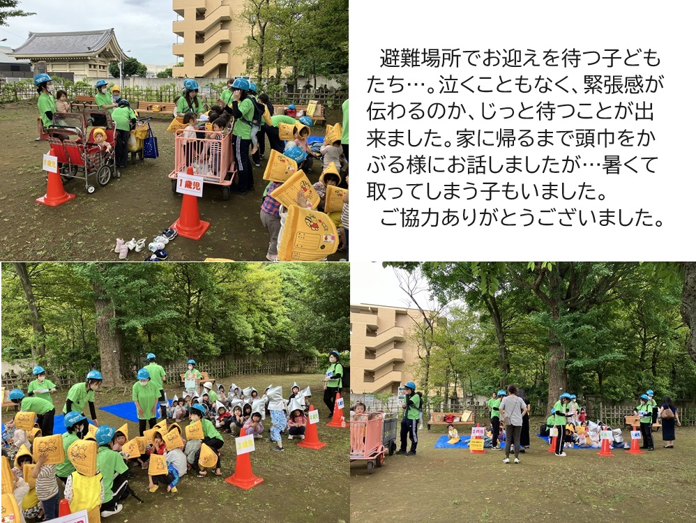 ホーム 引き渡し訓練 2024年6月3日 先週金曜日に引き渡し訓練がありました。緊急警報が発令され、保育園が倒壊の恐れがあると想定し、染井霊園まで避難しました。保育園に勤務する職員のほぼ全員が参加し、いざという時に備えて訓練を行いました。お家まで防災頭巾を被り、危険個所がないか確認しながら歩いて帰る様にお話をしました。1年に一度、「災害が起きてしまったら?」を家族で確認しあえる日になればと思っています。