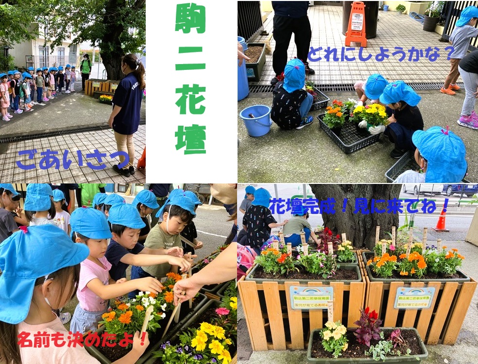 6月17日に年長クラスの子どもたちが染井霊園に行き、花壇にお花を植えてきました。好きな花を選んで植え、子どもたちが考えた名前のプレートを立ててきました。お散歩がてら見に行くのも良いですね。