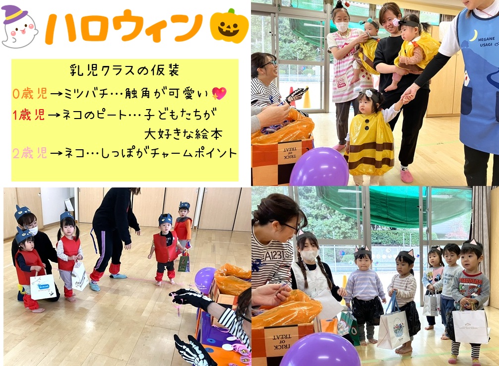 「トリックオアトリート!」お菓子をくれなきゃ暴れちゃうぞ~…今日はハロウィン。みんなで仮装してお菓子をもらいに行きました。仮装姿に驚いて泣いてしまう子もいましたが、お菓子をもらえて嬉しそうでした。