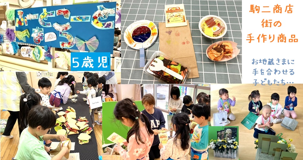 ホーム お買い物ごっこ🍔🍜🦗 2024年11月26日 11月半ばに「お買い物ごっこ」をしました。3・4・5歳児がお店屋さんになって、子どもたちが作った品物を売り、全クラスの子どもたちがお買い物を楽しみます。巣鴨地蔵通り商店街の看板をくぐり、その奥にはお地蔵さまもあり、子どもたちが手を合わせる姿が可愛かったです。