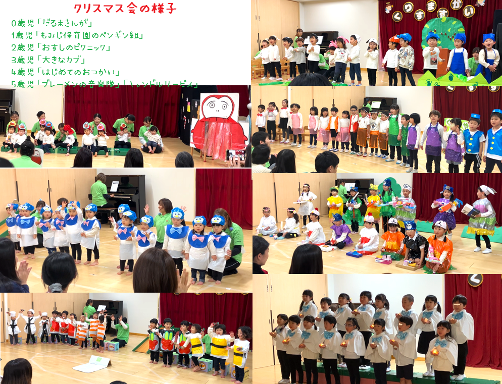 ホーム クリスマス会🎄 2025年1月14日 12月21日にクリスマス会を行い、各クラスの歌や劇を保護者の方に観ていただきました。子ども達の一生懸命頑張る姿や可愛い姿に感動し、成長を共に喜ぶことが出来ました。ご参加いただき、ありがとうございました。