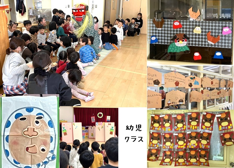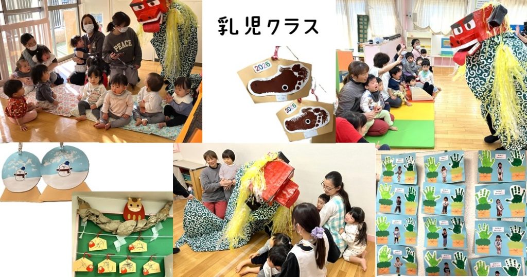 1月9日に新年お楽しみ会を行いました。福笑いで盛り上がり、ゲームは何が通ったのかを当てたり、十二支の歌を歌ったり…獅子舞は愛くるしい顔で優しい感じでの登場でしたが、泣いてしまう子もいました。しかし、頭を出してカプっとしてもらったりも出来ました。おやつにはお汁粉をいただき、みんなで新年をお祝いしました。