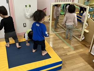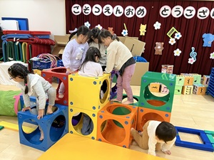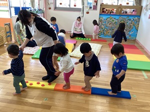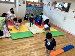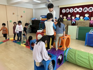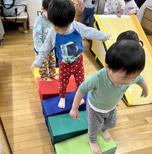 「運動遊び」をテーマに行っているプログラム。前回は体操の講師に来ていただいた時の様子をお知らせしましたが、今回は購入した遊具を使っての遊びを紹介します。乳児クラスが遊べるものは軽いマット・平均台・トンネル等乳児クラスがある2階に常備し、すぐに遊べる環境を整えました。しっかりとした素材の物なので安定して遊べて、職員も遊びの幅が広がり、子どもと共にワクワクしながら遊べています。幼児クラスは組み立てブロックを購入し、子どもたちで組み合わせを考えたりしながら楽しく遊ぶ姿が見られました。遊びを振り返り、子どもたちの意外な一面が見られたり、可能性の多さに気付きました。乳幼児ともに遊べる遊具もたくさん購入し、令和7年度も引き続きたくさん運動遊びを行っていきたいと思います。