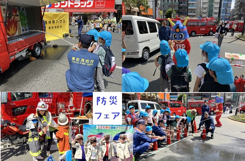 ホーム 防災フェア 2025年6月6日 本日、巣鴨駅ロータリーで行われていた「防災フェア」に年長組が参加しました。放水・煙・消火器・記念撮影等暑い中でしたが、いろいろな体験をしてきました。起震車は代表の子しか体験できなかったのですが、震度7の揺れに驚いた様子でした。