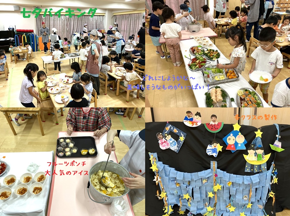 7月7日は七夕…と言う事で、七夕とは?のお話を各クラスに合わせた内容で伝えました。♪ささのはさ~らさら~…とお歌も歌ったのですが、小さいクラスの子も一生懸命歌っていてとても可愛かったです。幼児クラスでは「マジック」が披露され、「わぁ~!」と立ち上がって喜んだり驚いたりする子がいました。1日遅れましたが、8日は幼児クラスが楽しみにしていたバイキング。どれを食べようかなぁ~と目をキラキラさせていて、同じものをたくさん取る子がいたり、好きな物だけを一つずつ取る子がいたり、レモンやパセリを好んでを食べたり…思い思いに楽しみながら食べていました。子どもたちの喜ぶ姿を見てうれしく思いました。給食の先生方ありがとう💕
