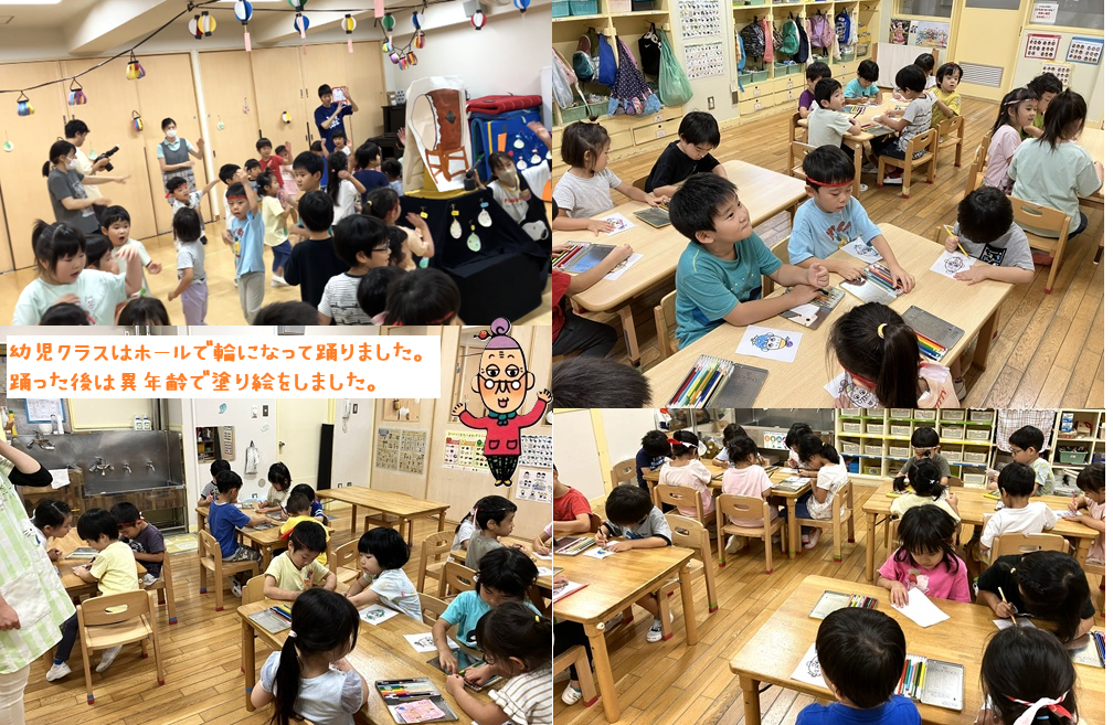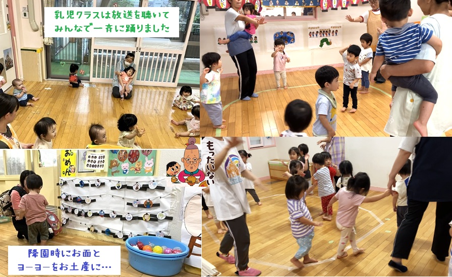 ホーム 夏まつり🎐 2025年9月11日 9月4日に「夏まつり」を行いました。4歳児が中心になって♪もったいないばあさん音頭を踊りました。事前に4歳児の子どもたちが乳児クラスに行って一緒に踊ったり、幼児クラス合同で練習もしました。飾りの提灯は手作り…。幼児クラスは櫓に見立てた太鼓を囲んで、乳児クラスは放送を聴いて、各クラスで一緒に踊りました。降園時は事務所前にお面とヨーヨーを準備し、親子で好きな物を選んでお持ち帰り…。楽しく過ごすことが出来ました。