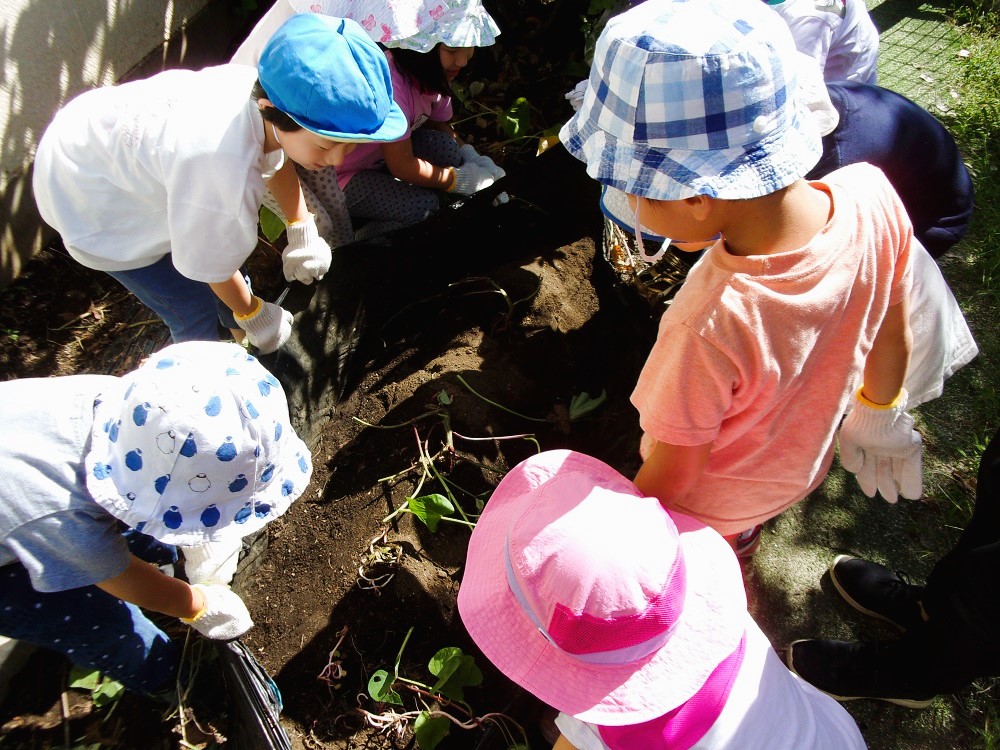 ホーム お芋が出来たよ🍠 2022年9月28日2023年3月1日 5月に植えたサツマイモの苗…。すくすくと成長し、本日掘ってみました。「ちゃんとできているかなぁ~」と不安でしたが、立派なお芋からかわいい小芋まで、たくさんではないけれど収穫できました。お芋の頭が見えると早く抜きたいのを我慢して、まずは周りの土を一生懸命に堀り、抜けたときには「やったぁ~!」と大喜び。真っ黒になりながらもお芋を探して懸命に掘り、とても楽しそうでした。さてさて…どのようにいただこうかなぁ~…。 5月に植えた頃の苗 本日の収穫…まだあるかも? 一生懸命掘っています 「あったぁ~!」 ツルや葉が大きく成長 親子イモ 「あるかなぁ~?」