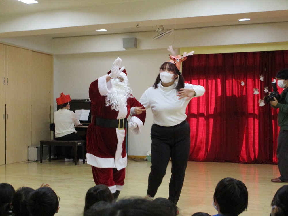 そして今度は職員からのプレゼント。ハンドベルで「♪ジングルベル」を奏でた後、「♪サンタが街にやってくる」を合奏。子どもたちは大爆笑でした。そしてお待ちかねのサンタの登場!1クラスずつプレゼントが紹介されると「やったぁ~!」と歓声が上がり大興奮。紹介されるまでのどきどきした様子が伝わり、とてもかわいい姿が見られました。サンタさんと色々お約束をしてプレゼントをもらい、早速遊んでいました。乳児クラスにもサンタさんがプレゼントを届けて、又次の保育園へと向かっていきました。