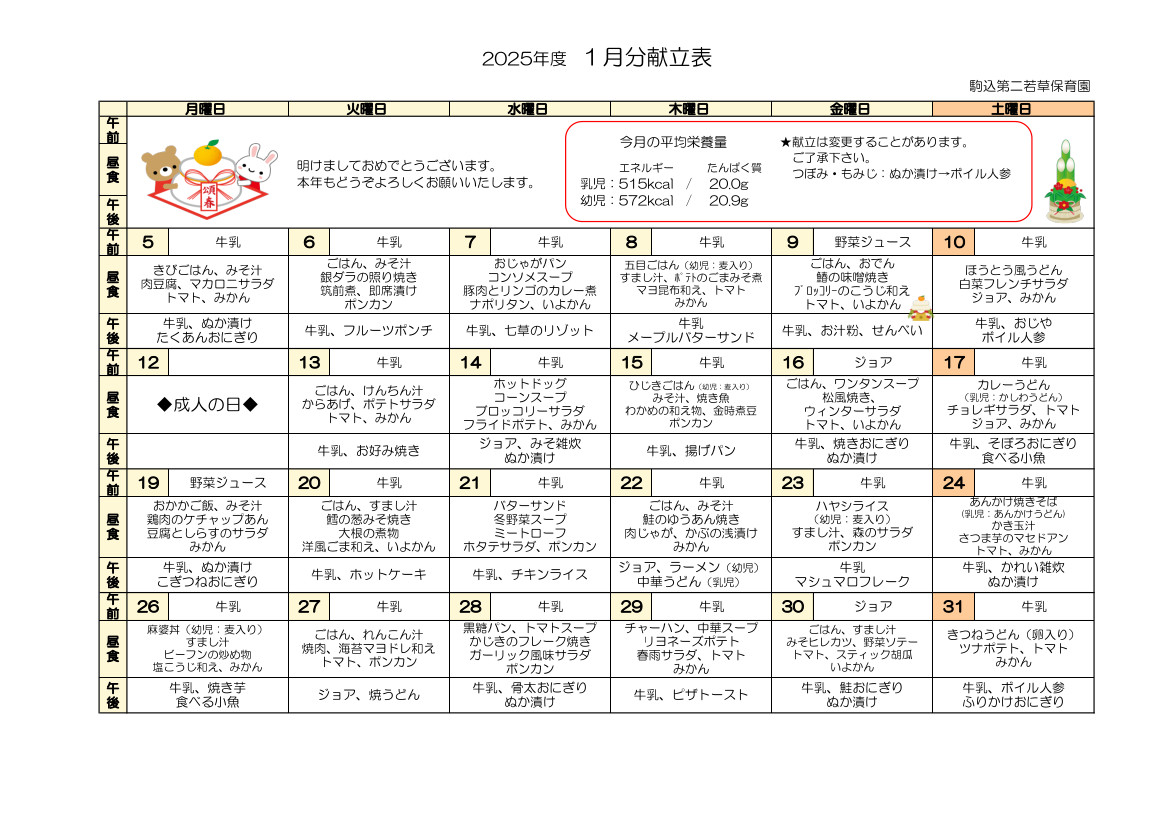 ホーム 1月の給食 2026年1月9日 今月の献立表 ※午前は乳児のみです 簡単レシピの紹介 みんな大好き♪♪【ピザトースト】の作り方 材料 食パン6枚切り(お好みの厚さで)……適宜 ケチャップ……適宜 玉ねぎ……適宜 ピーマン…適宜 コーン缶…適宜 ピザ用チーズ…適宜 作り方 玉ねぎ、ピーマンを短めの千切りにします。 食パンにケチャップを塗りSTEP.1、コーン缶、ピザ用チーズをのせます。 チーズが溶けるまでトースターまたはオーブンで焼いたら完成です♪ 食育の一例 季節豊かな行事食こどもクッキング毎月行われる食育DAY(実際に使用している食材を媒体としてのクイズなど・・・) 食事形態 乳児食 離乳食・中期食 離乳食・完了食 離乳食・初期食 離乳食・後期食